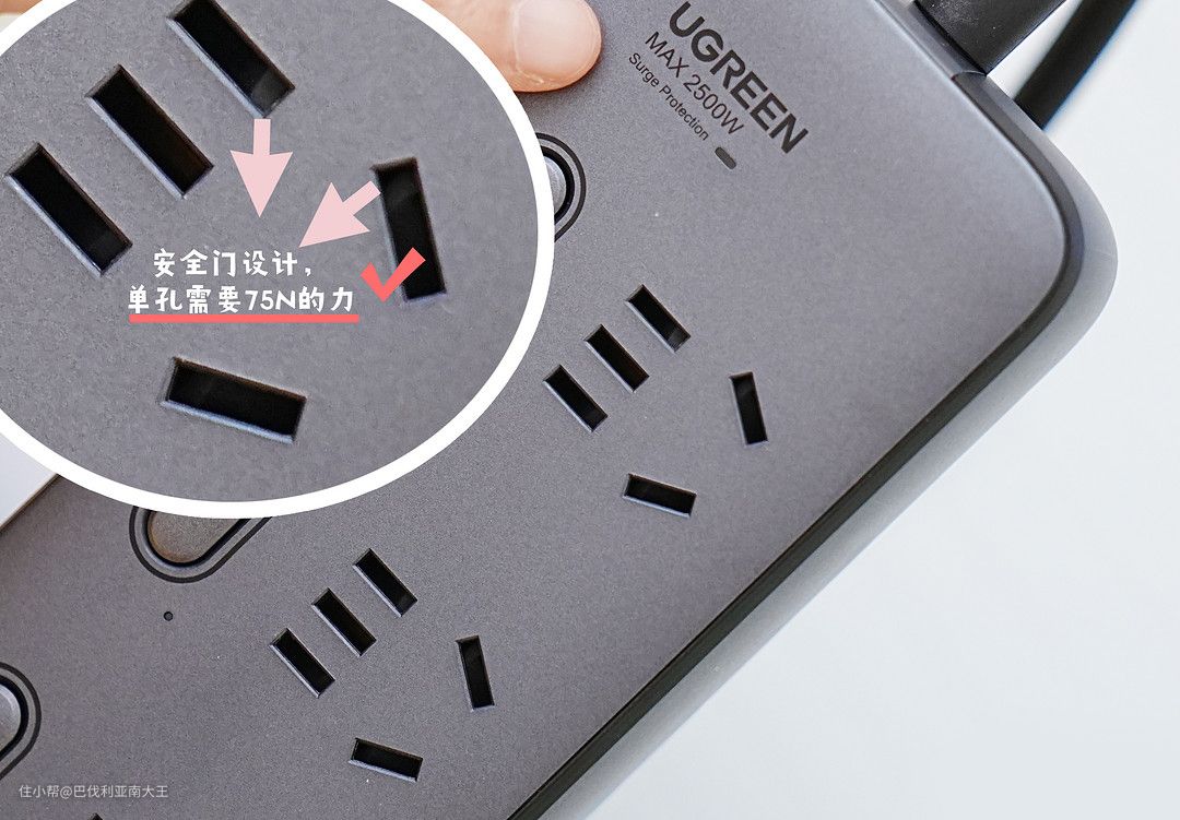 以我家这款绿联新国标6位分控防雷排插为例,从插孔外面就可以看到插口内的挡片,可防单极插入,必须两孔或三孔同时插入达到一定的力度才可以使用(绿联此款安全门单孔需要75N,约15斤左右的力才可以打开)。