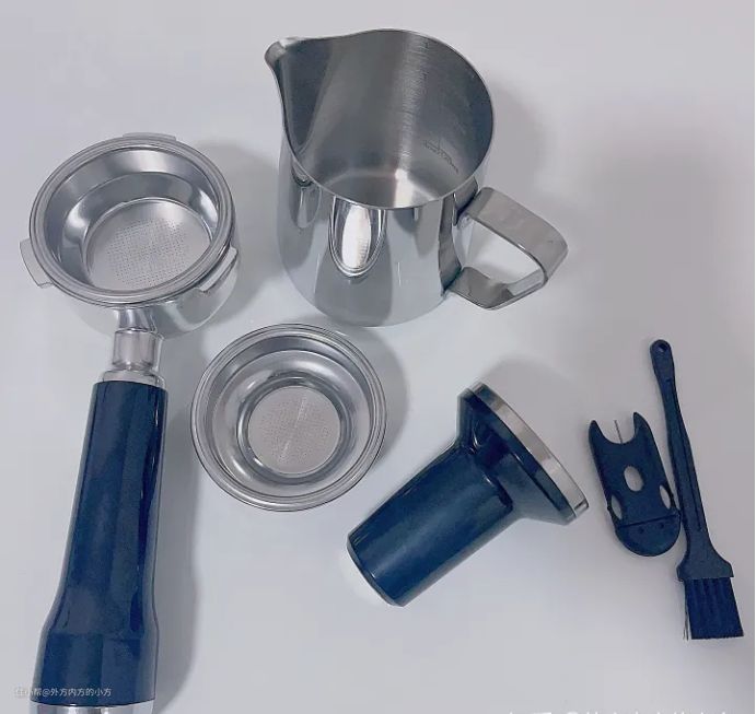 有标配的1只58mm的双导流嘴萃取手柄,粉锤,拉花缸以及单双份粉碗各一只。制作咖啡该有的东西它都有不需要再额外消费。而且58mm的双份粉碗也可以容纳更多的咖啡粉,这样我们就可以大容量的萃取咖啡,可以满足更多人同时喝咖啡的需求。
