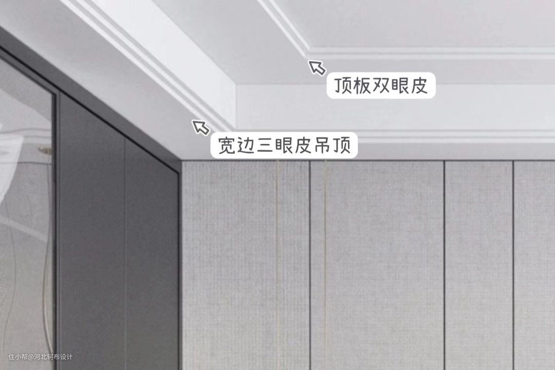 ●网红双眼皮吊顶扥类型及款式主要有窄边双眼皮吊顶、宽+窄边双眼皮吊顶、宽边三眼皮吊顶+顶板双眼皮、双眼皮+石膏线吊顶。如下图: