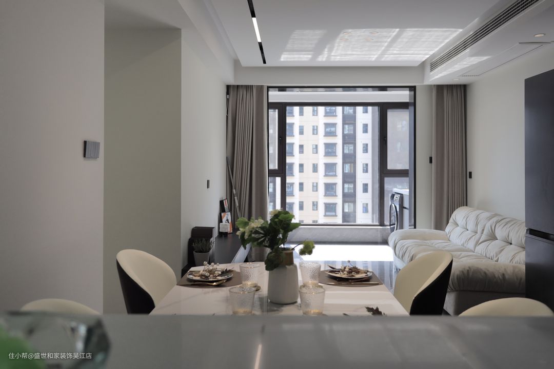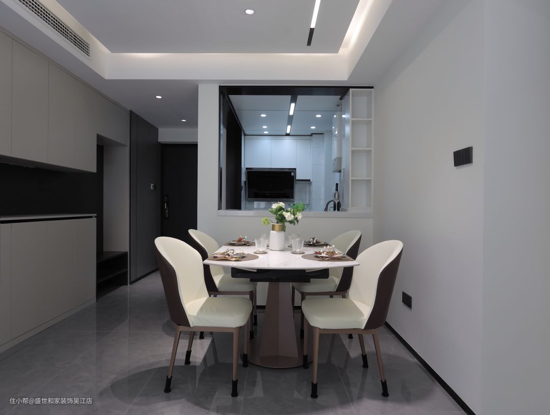 餐厅不做多余的装饰,以通透的空间设计,搭配兼具功能与美观的餐边柜,中间镂空可以放一些小家电和颜值高的精美摆件。
