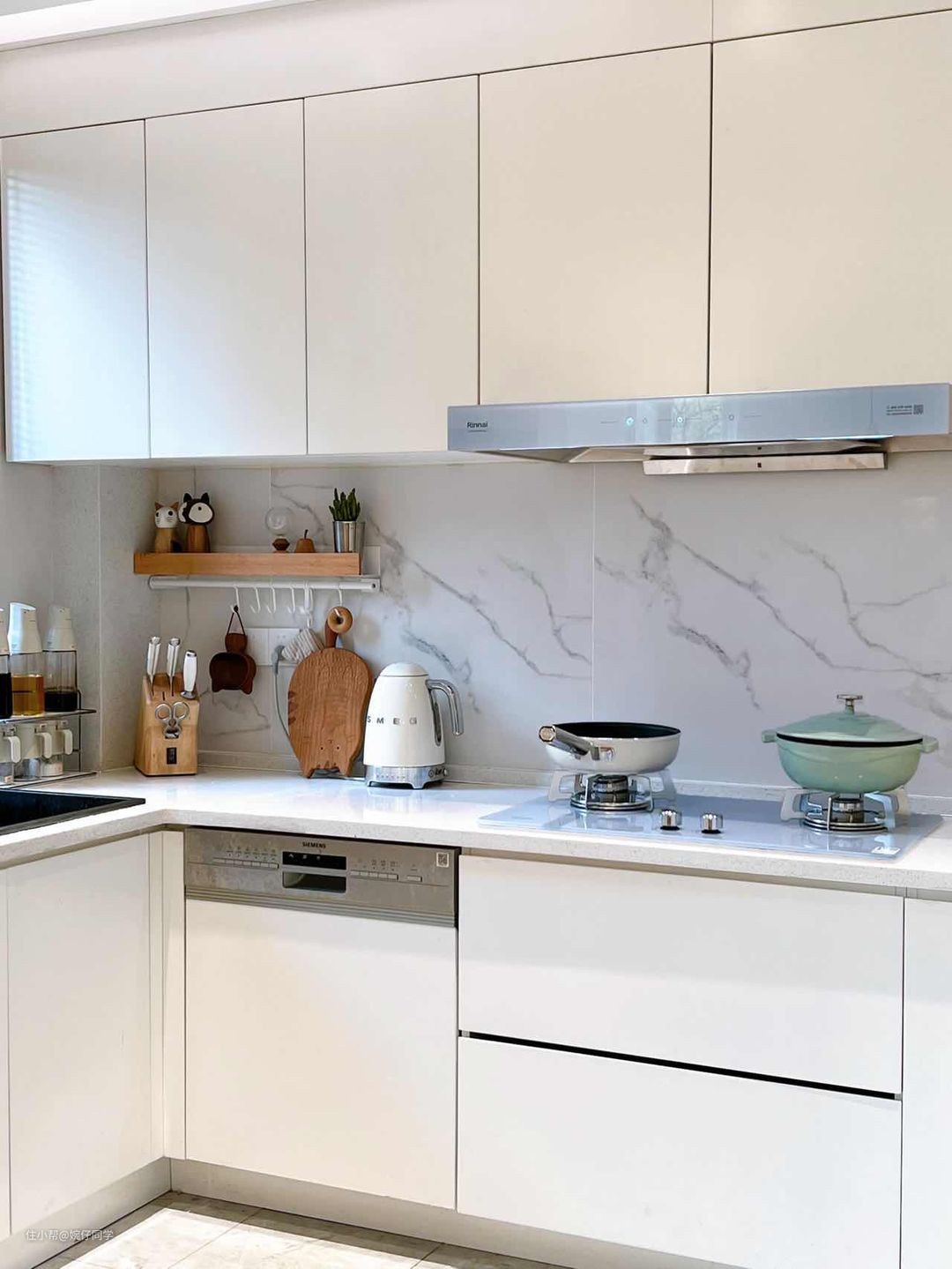 综合了以上的方面,也考量了目前厨房的情况,也为了让厨房焕然一新,我决定换一个装修风格,正好相中了一款烟灶套装,便决定将厨房装修成白色系了~~~这套直击我审美点的厨电就是林内的淡氧蓝的马卡龙烟灶套装。