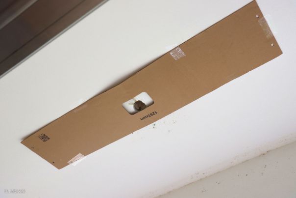 师傅将原来的晾衣杆和吊灯卸下之后变找好了位置,将打孔的辅助纸板贴在天花板,一共有四处位置需要打孔。