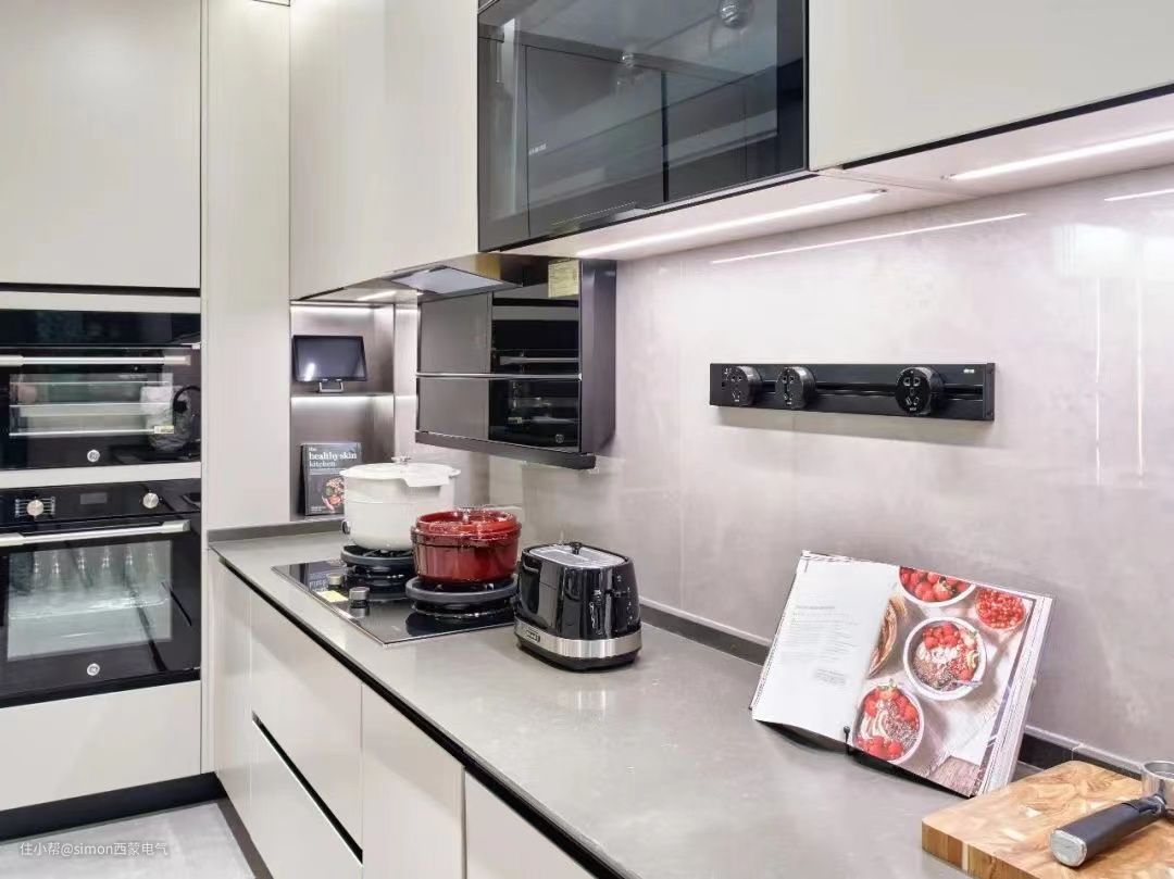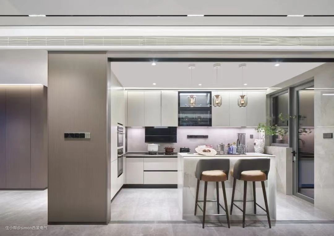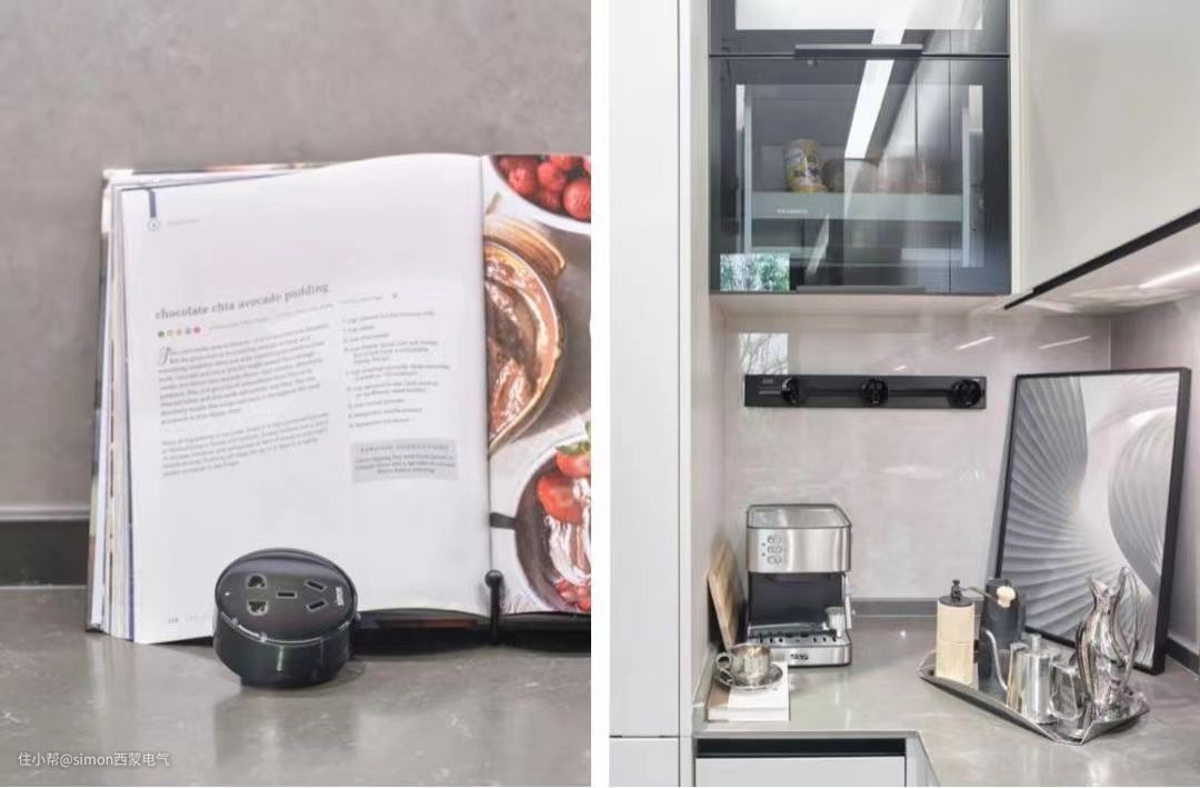 2.厨房连体插座带开关(或轨道插座):五孔带开关,整洁美观,满足厨房环境下的用电需求,电饭煲、料理机、煮蛋器灯电器无需多次插拔,节能更安全。厨房小家电较多,安装轨道插座可以根据需要增减插头,延轨道滑动,也能让厨房充满现代科技氛围和美观视觉。