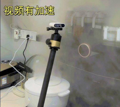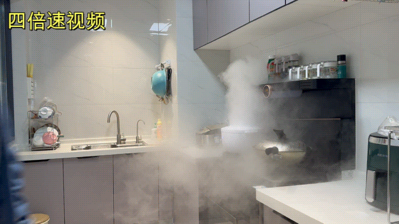 几乎同样的状态下,开启集成灶的抽烟,效果依旧是非常棒!一瞬间厨房里面的烟气都被吸走了。