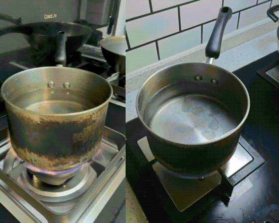 我另一套房子用的是云X的燃气灶(中端价位),使用同一个锅,把水都装到一样的刻度,火力开到9点钟方向的最大火力。实测凯度集成灶水烧开到密集水花耗时5分32秒,传统的云X燃气灶耗时6分22秒,集成灶的速度快了50秒钟。