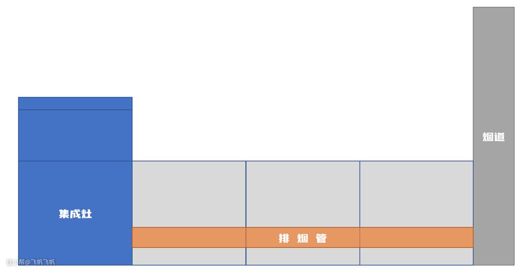 集成灶的烟道是走橱柜下方的,因此集成灶是贴着烟道安装最好(实际还是最少要隔开25-30CM,中间需要安装止逆阀与连接扣等)。如上图集成灶距离灰色烟道间隔约较远,橱柜下方都会有烟管,中间三个柜子都无法安装洗碗机一类的设备了。
