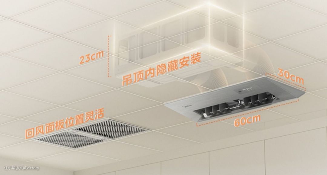 以美的厨房空调100为例,它的内机采用超薄设计,长度66cm,高度只有22cm,安装只需要确认吊顶距离屋顶≥25cm即可,也不用拆卸吊顶龙骨,非常方便。