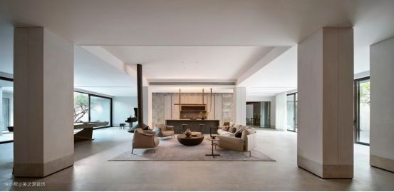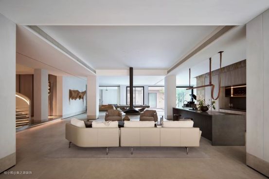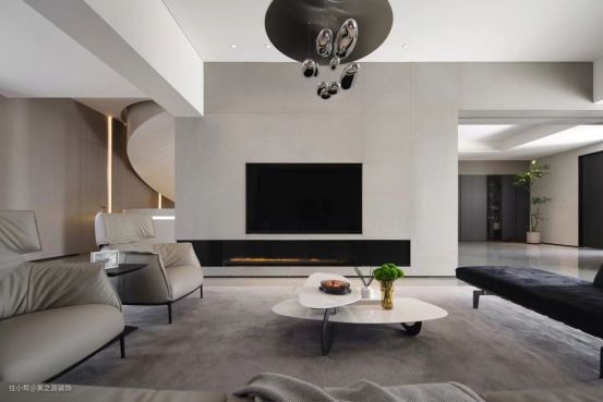 在别墅二层客厅延续了一楼客厅的整体色调 ,白色茶几圆形大理石+清风徐来的绿色作为空间小小的点缀,为空爱增添了几分趣味性,慵懒黑色沙发椅+黑色的艺术灯造型,相同色系的融合为空间带来浪漫的基调。
