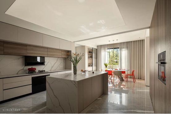 客餐厅一体化的设计,在材质的选择上采用了浅灰色大理石瓷砖与白色相互融合,中间白色大理石岛台加上插花瓶里面的花,赋予空间生命力,无主灯设计加上空间的明亮色彩搭配让空间的光感大大提升。落地窗+窗外的景色让就餐环境更加舒适,增加食欲。