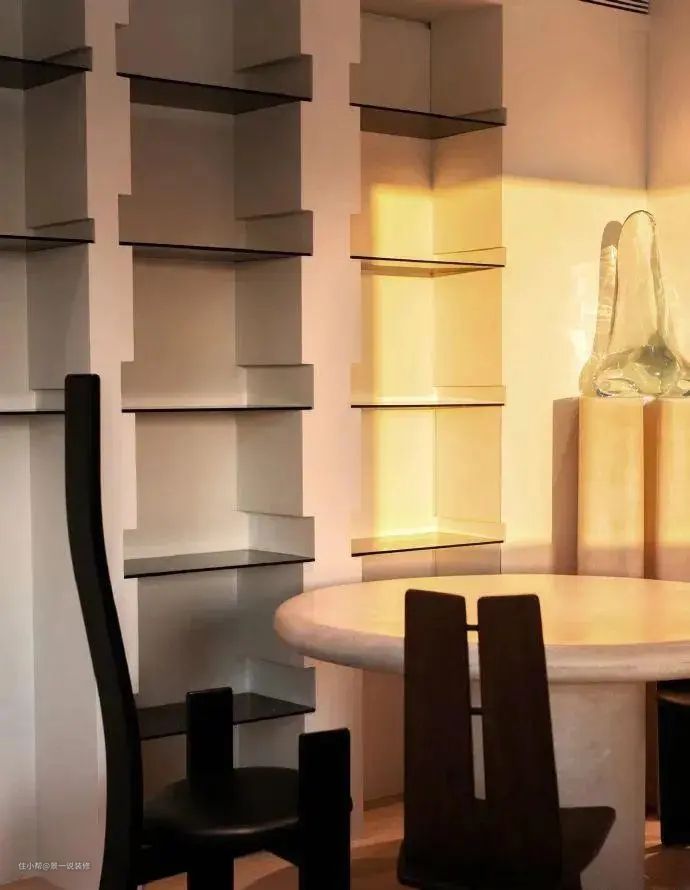 餐边柜不同于我们常见的定制柜或者是成品柜之类的,设计师为他设计的是壁龛形式的餐边柜,里面收纳摆放着很多书籍,这种柜子看上去非常简单,在阳光下显得异常高级耐看。