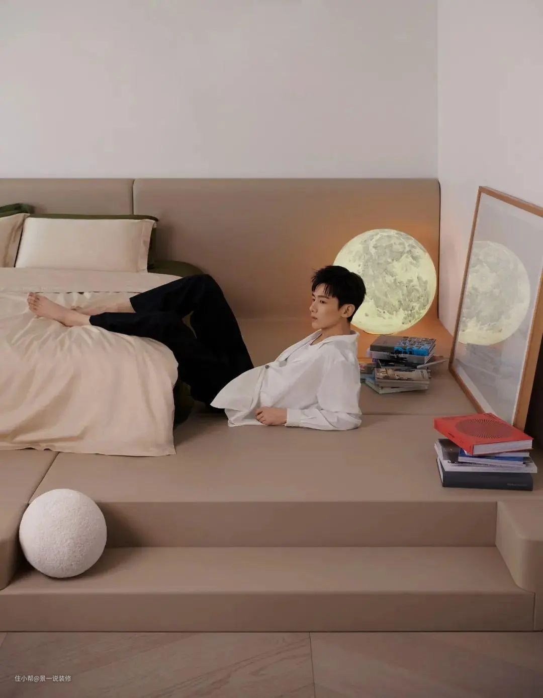 台面上全用皮质饰面,就等于整个地台都可以当床,随时随地都可以躺下,地台上墙边是一幅名家的摄影作品,在床头边上摆放着一个梵几的月球灯,很有氛围感也特别治愈。