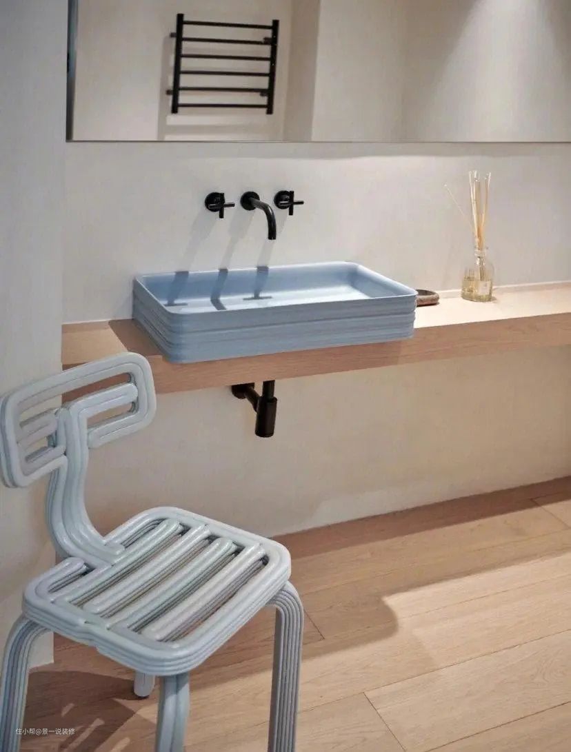 洗漱区是木地板,搭配蓝色的洗手台与椅子。