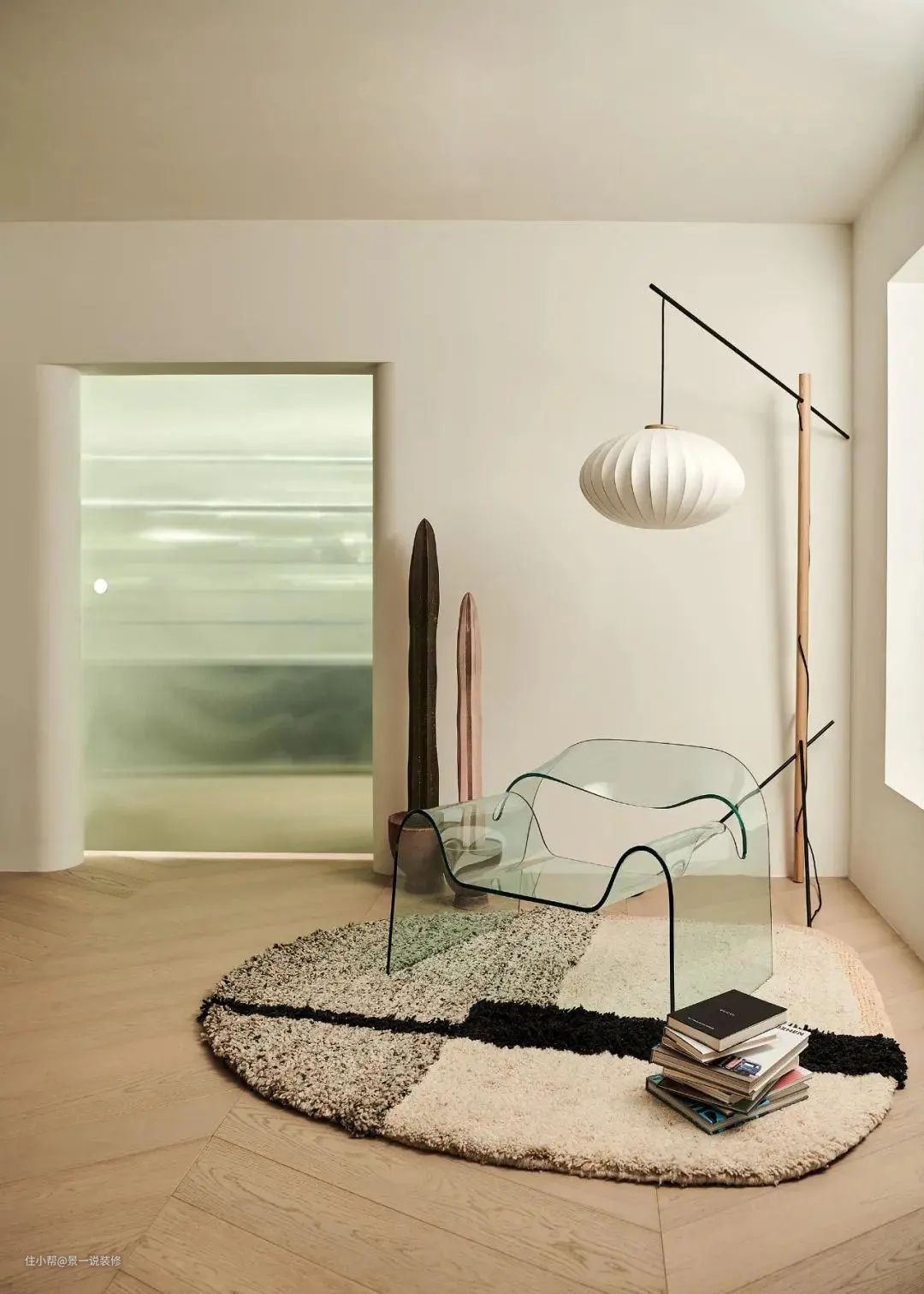 卧室窗户边上布置了一个阅读区,一张知名传奇女建筑师设计的全透明玻璃桌椅,优美的线条,恰到好处的比例,看上去很轻盈,没什么存在感,纯净清澈。
