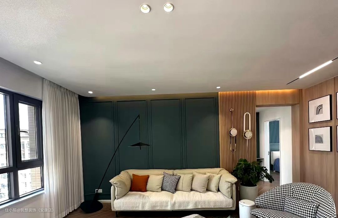 首先悬浮吊顶下吊10cm,四周间隔20cm,这也就意味着层高低于2.6m的家庭要慎重选择,否则会显得整体空间非常压抑,另外如果家里是中央空调,则需要下沉40cm,在吊顶容纳中央空调的同时,把客餐厅的横梁包住。