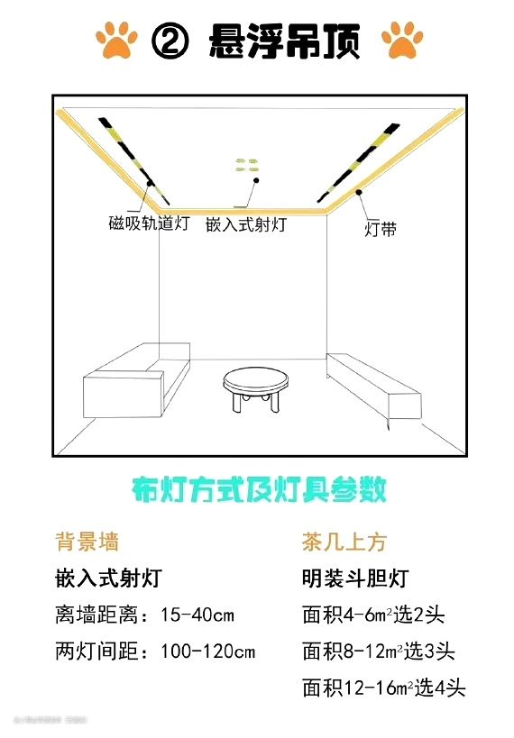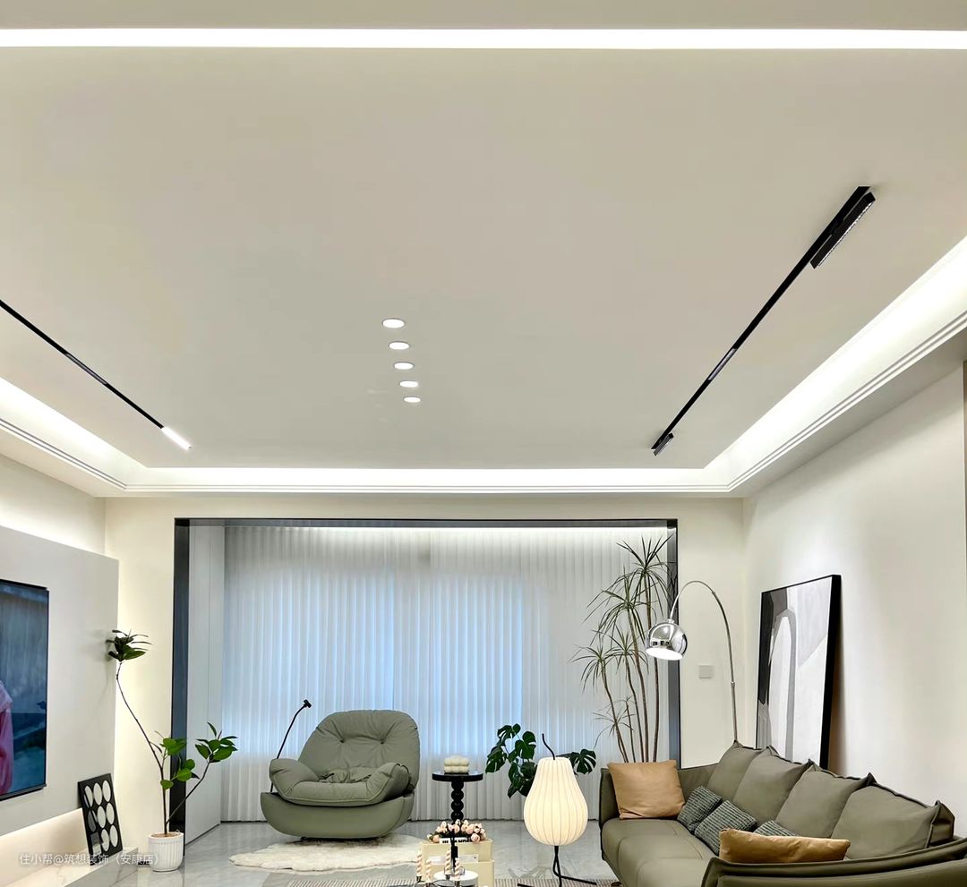 悬浮吊顶通常与无主灯设计相搭配,能够起到使房间效果更均匀、提升房间氛围的作用。在无主灯设计中,一般以磁吸式轨道灯、射灯等搭配更为常见。