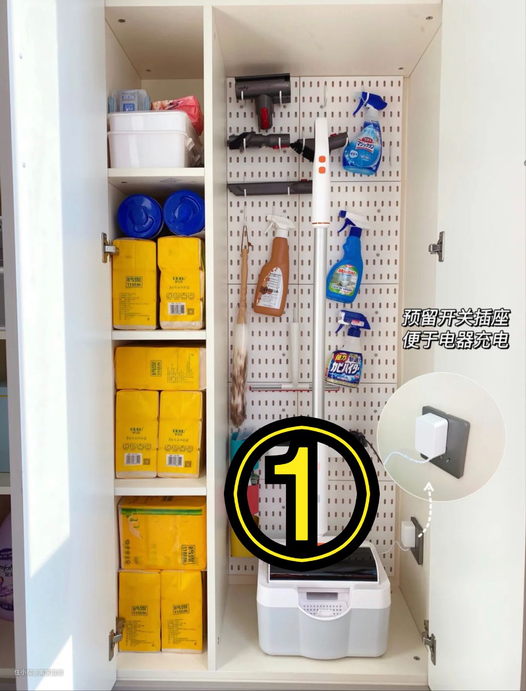 先来说说阳台的装修,一般很多人都会把阳台分成两个区域,一边定制收纳柜用于收纳各种生活小家电。另外一边则是专属的洗衣机、烘干机区域。所以插座的预留就很好确定了。