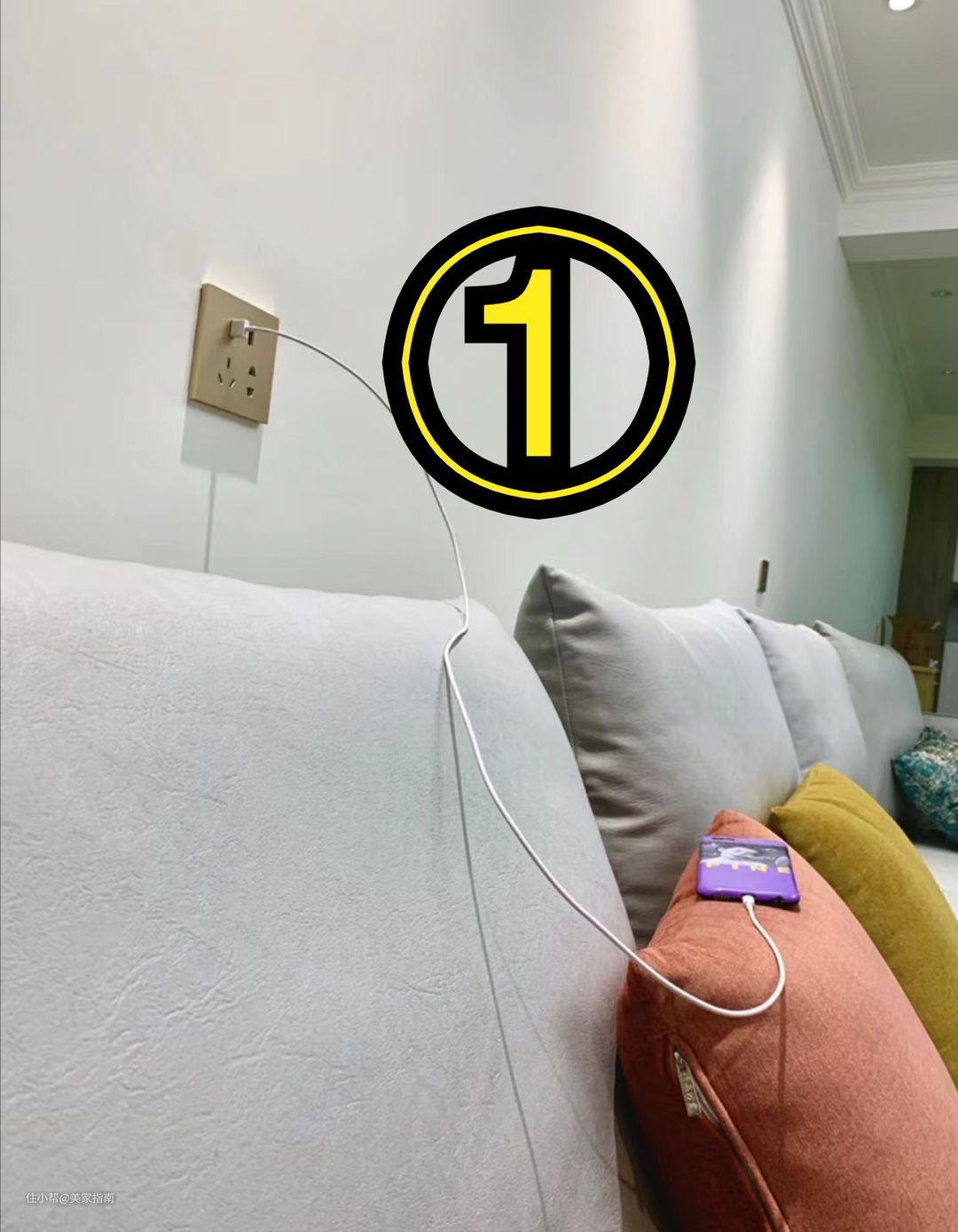 沙发的位置的插座,也是分为两个部分,一个在用于手机、平板和电脑(图①),另外一个预留在沙发的两侧,用于扫地机器人、钓鱼灯以及其他生活家电(图②)。