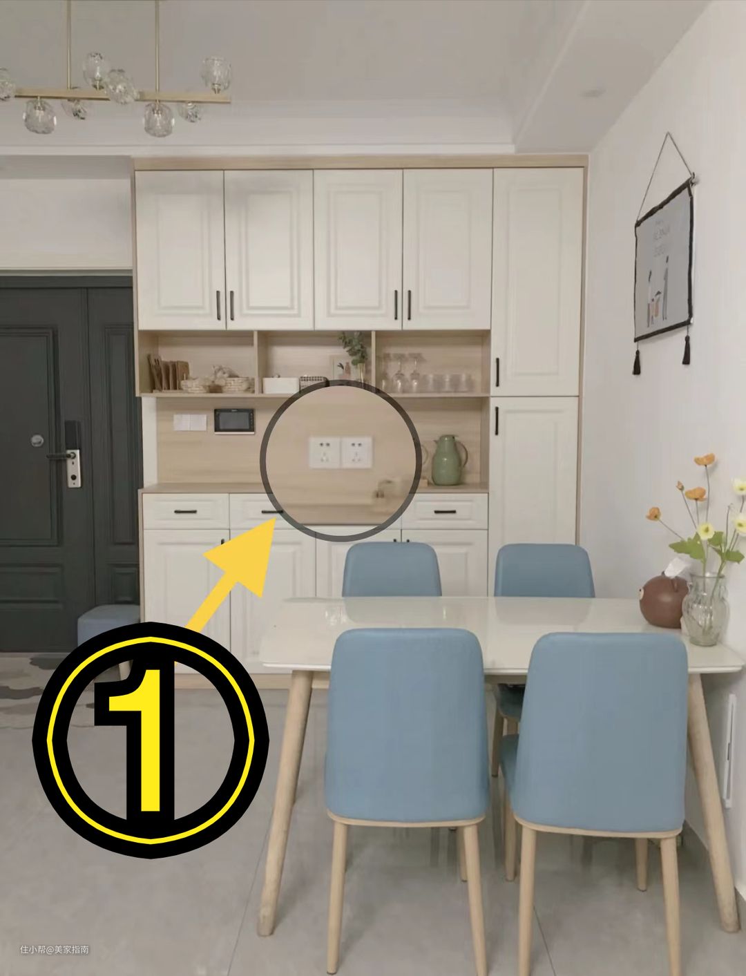 餐厅的插座,还是分为两个部分,一个是餐边柜的位置,另外一个则是餐桌的位置。具体如下: