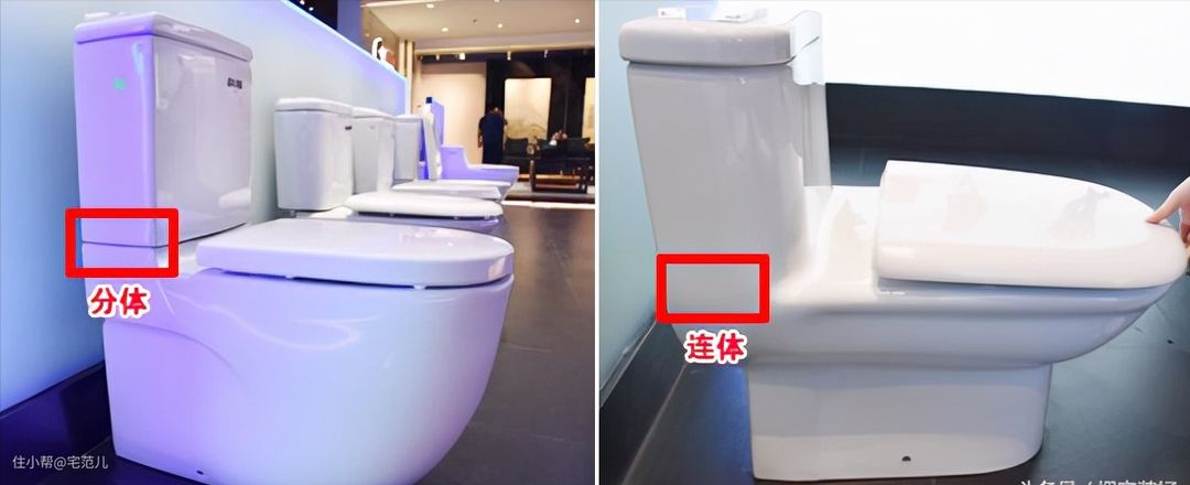 连体马桶的水箱和坐便器是连接在一起的中间没有任何的缝隙,而分体马桶的水箱和底座是分开的,存在着一定的缝隙。