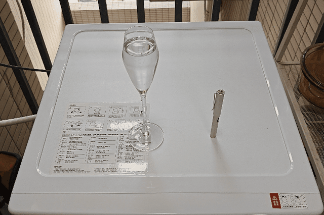 由于石头H1采用了DD直驱电机设计,整体的工作震动和噪音控制情况都比较不错。酒杯、钢笔等参照胡放置在工作中的石头H1,酒杯没有液体溢出,钢笔也未滑倒,参照物的晃动弧度较为轻微,洗衣机工作运行可以说十分平稳。