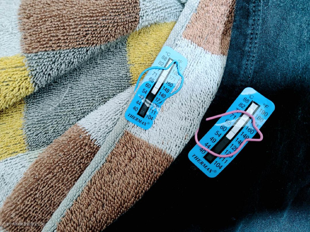 这里为了验证石头H1分子筛技术工作没有经过高温烘干,二狗选择在清洗的衣物中添加测温纸来监控洗烘整个过程的温度变化区间。二狗在普通洗烘模式下进行清洁,两件衣物的的温度区间最高为54℃。说明石头H1在整个烘干过程中,温度都能保持较低水平(羊毛模式下工作温度可以控制在37℃左右),可以进行丝绸、羊毛制品的清洁,无需担心变形、缩水和褪色的问题。