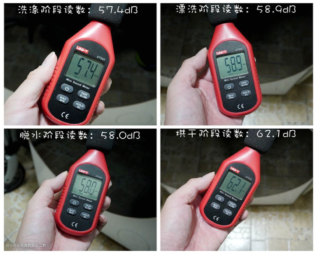 在环境噪音为38dB的背景下,实测使用噪音测试装置接近石头H1,选取不同清洁状态下进行测试,得到如上数据。对比官方宣称的68dB来说,实测数据稍低一些,最大噪音为62.1dB,整体的噪音控制还是比较不错。日常实际体验来说,只要不用在洗衣机工作的时候保持特别近距离的接触,洗衣机工作噪音的影响基本可以忽略。二狗在距离生活阳台约四米的客厅,基本就感觉不到洗衣机噪音的存在。
