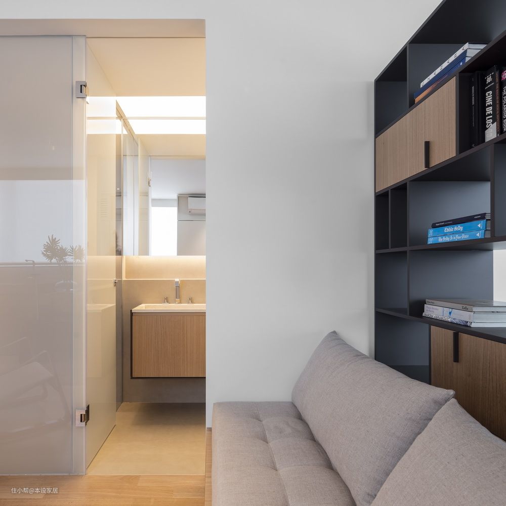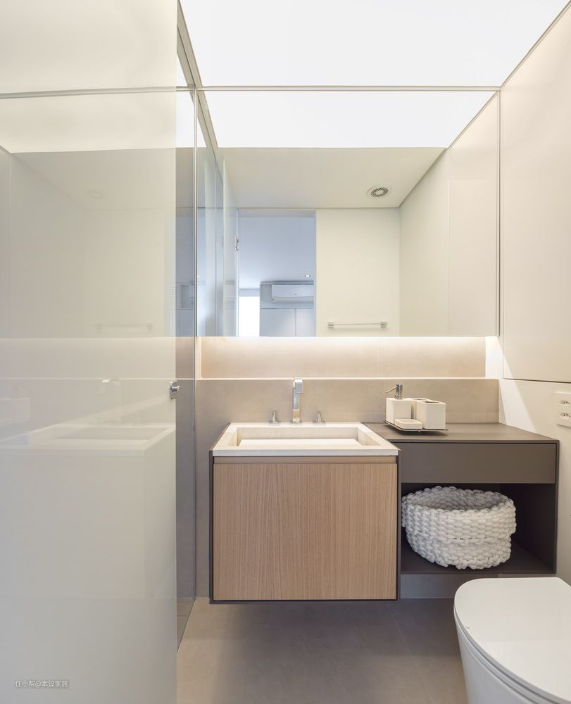 卫生间面积不大,布局紧凑,浅色调搭配暖白光,使空气都变得柔和,给人一种舒心的感受。带背光的镜面柜和半高的台面,满足清洁用品的储物需求,也让小姐姐无论白天还是夜晚化妆和护肤都是美美的,同时具有延伸空间视觉的功能,完全没有住在小房子里时,那种拥挤逼仄的感觉。