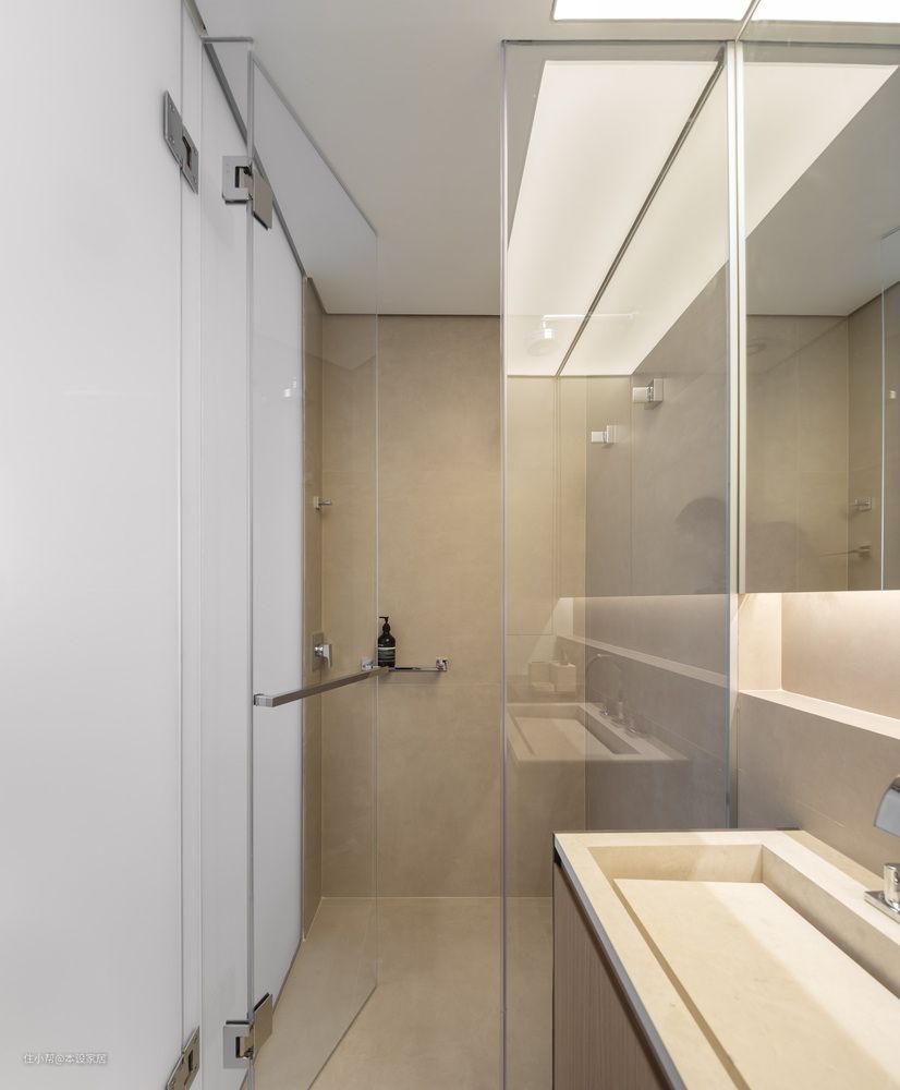 淋浴房采用清玻璃做隔断,通透不挡视线,又体现出一种简约风的特质,墙地面铺贴大地色砖,于细节中感受到整体温暖舒适的氛围。