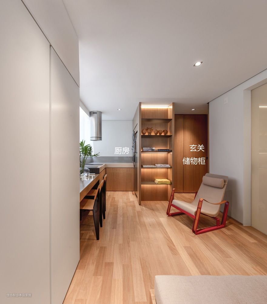 小小的玄关采用素雅白墙和温润原木的经典搭配,奠定了全屋的主基调,温暖的氛围超治愈,让人感到无比轻松。回到家先坐在单人椅上稍作休息,换下来的鞋和衣物,放置到右边实木储物柜内。[比较遗憾的是,储物柜对面的镜子没有拍到照片]