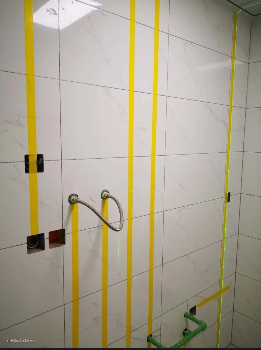 贴完瓷砖后,用胶带标记好水电管线位置,后期安装卫浴和五金件的时候需要在墙面瓷砖上打孔,这样很容易避开电线和水管被隐藏的位置,难免会打到水管上,一旦打到水管上,后期维修起来就真的很麻烦。
