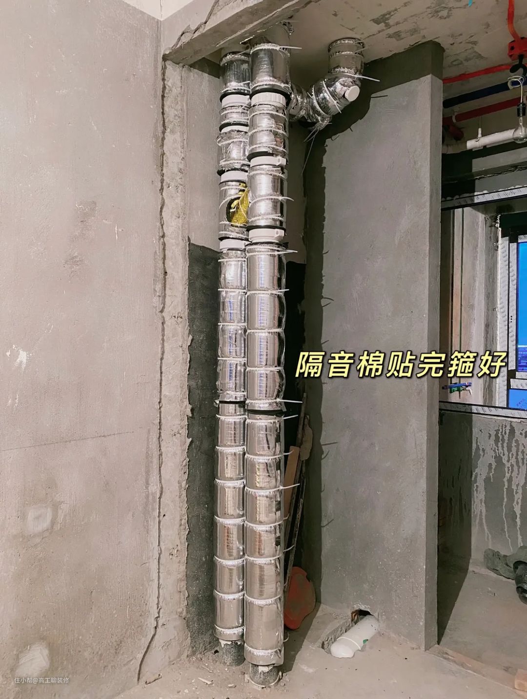 内层先用阻尼片包裹起来,外层选用隔音棉材质来隔绝水流的声音,如果选用红砖包下水管的话,就不需要两层,只要一层阻尼片就足够了,但是横向走管不能省略。