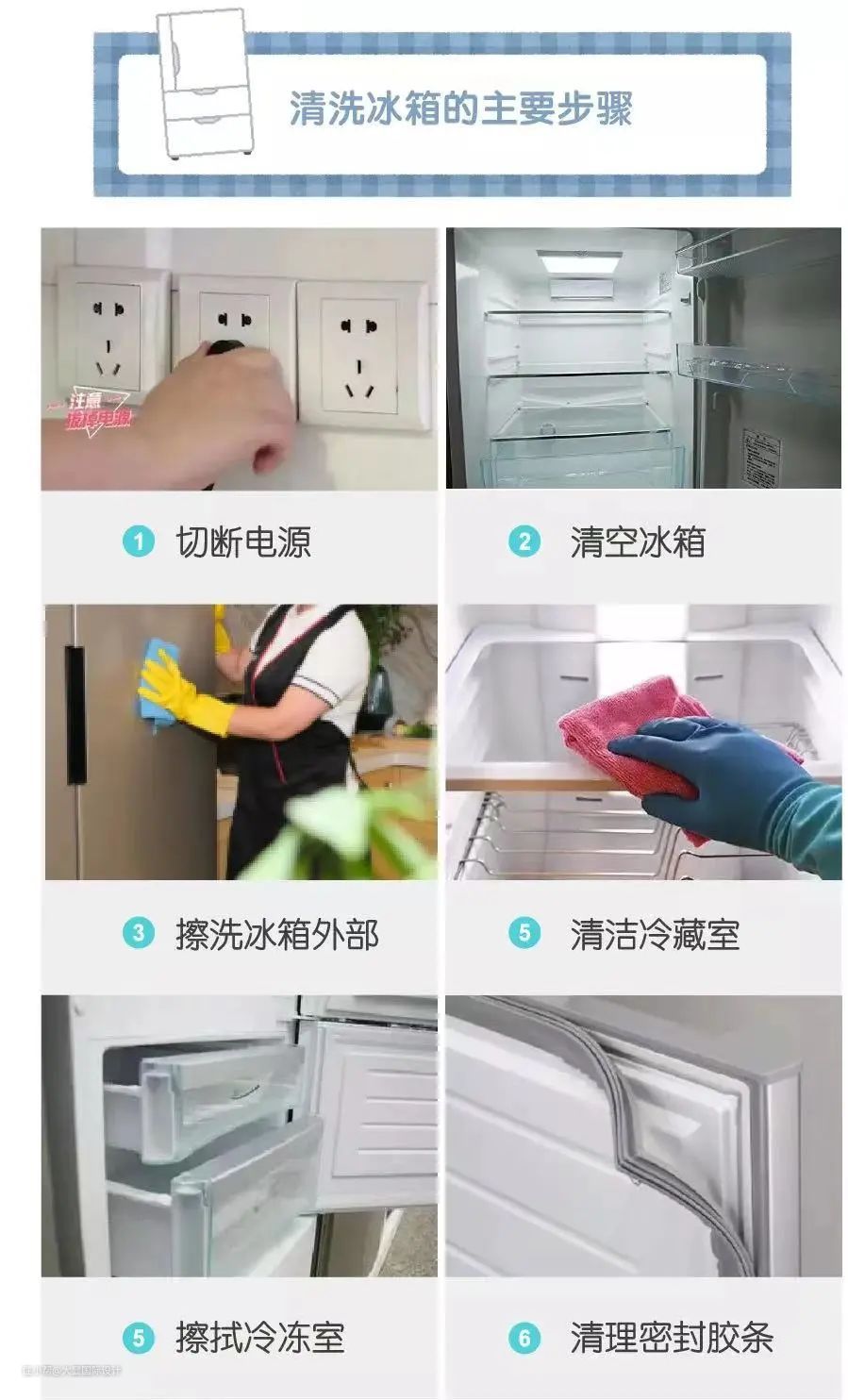 冰箱清洗可按照“周小清,月大清”的原则进行。小清洁期间不用断电,用抹布蘸小苏打、洗洁精、酒精擦拭,然后擦干即可;断电后内外清洗并晾干。