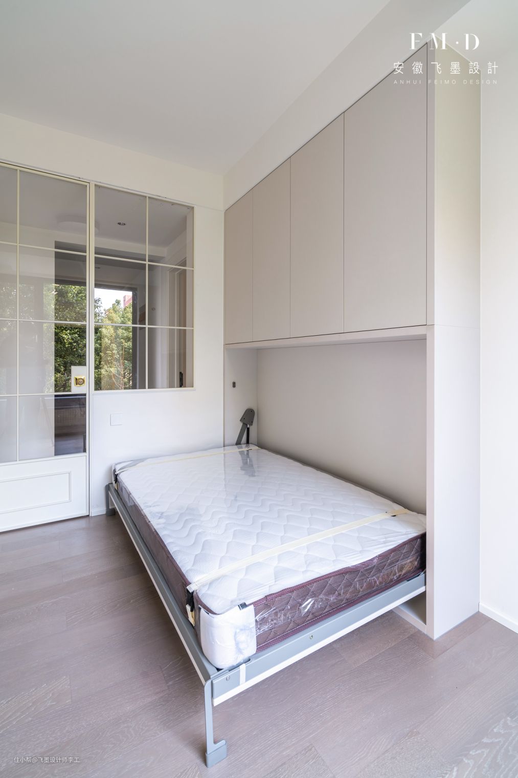 墨菲床和衣柜作为组合定制,设计成一个整体,看起来像隐形的柜子。带有组合柜,因此具有很好的收纳作用,在开放格中摆放书籍,摇身一变为书架,储物格中还可以叠放衣物,落地长柜则可以悬挂衣物,抽屉可以用来收纳一些小物品。