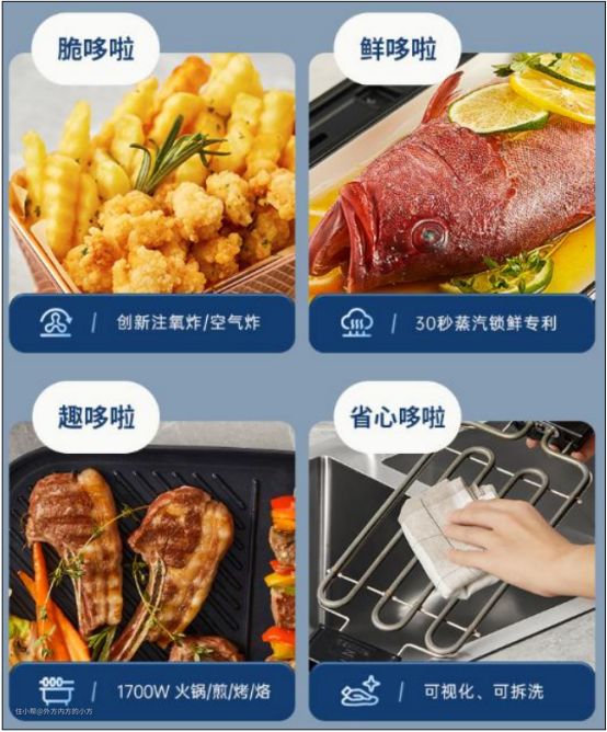 功能:空气炸、蒸汽炸、蒸、(微量高频进水 30秒快蒸)烤、 煎、火锅、烙