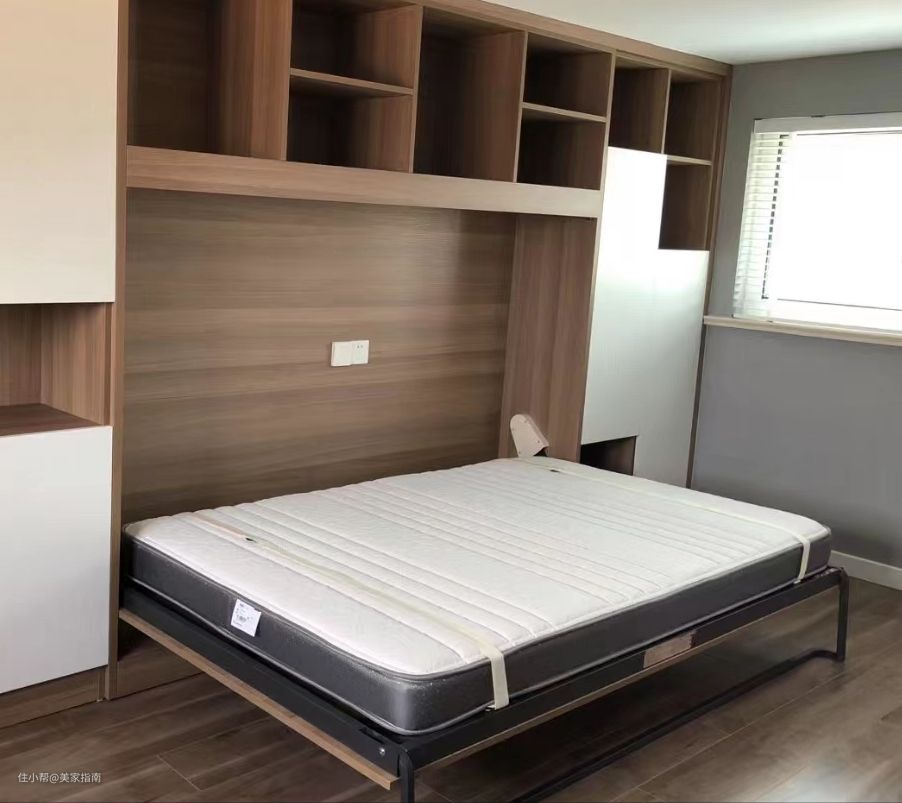 但真正入住后就会知道,隐形床多半是直接放倒在地板上当普通大床使用的。亦或者是一直保持“隐形”的状态。因为反复放倒、隐形,这个操作本身就不实际。毕竟每次操作都得重新铺一次被褥,可以说相当鸡肋。