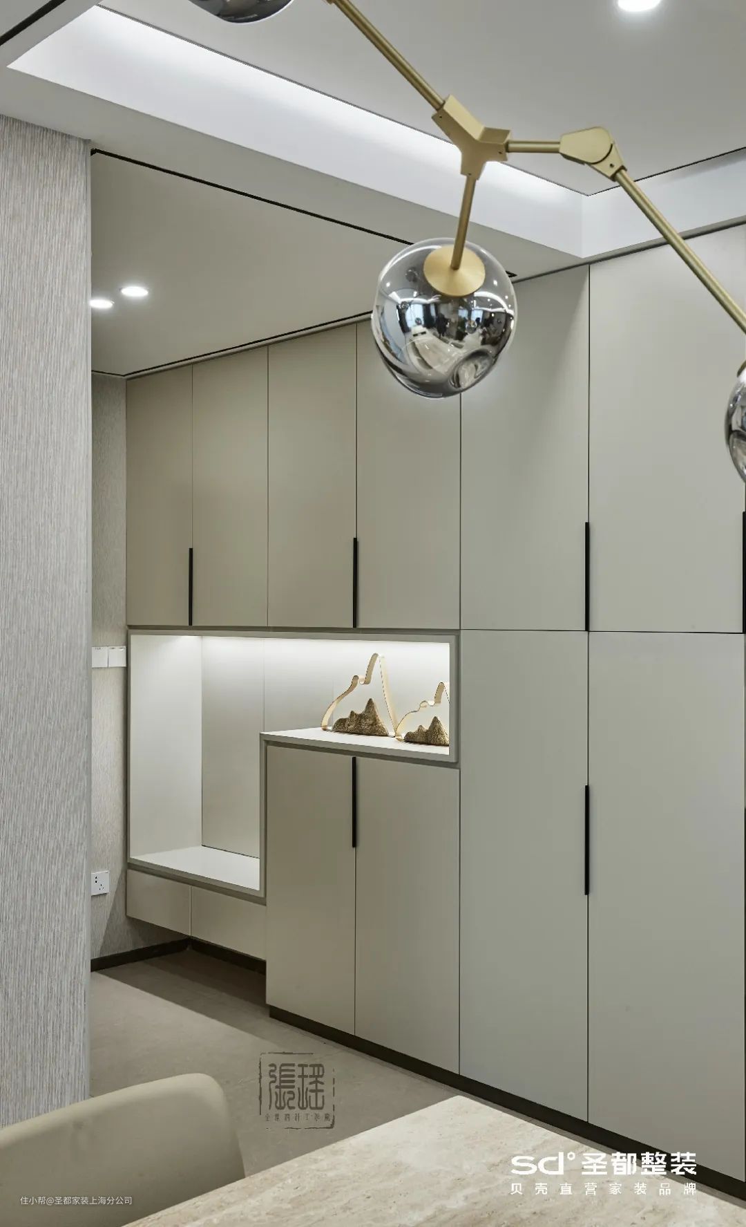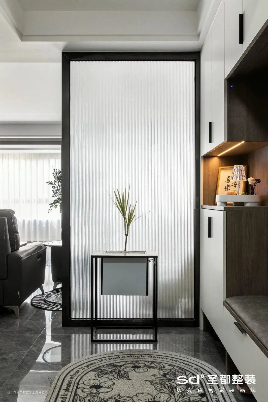 在《清泉石上流》的案例中,玄关一侧定制收纳柜,一侧设计成端景,兼顾颜值与功能。最妙的是长虹玻璃的仙气加持,让空间趋于空灵澄澈。