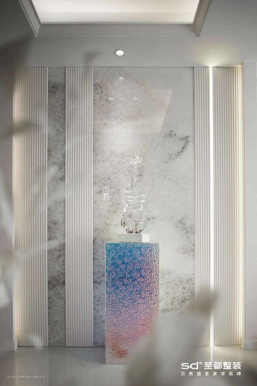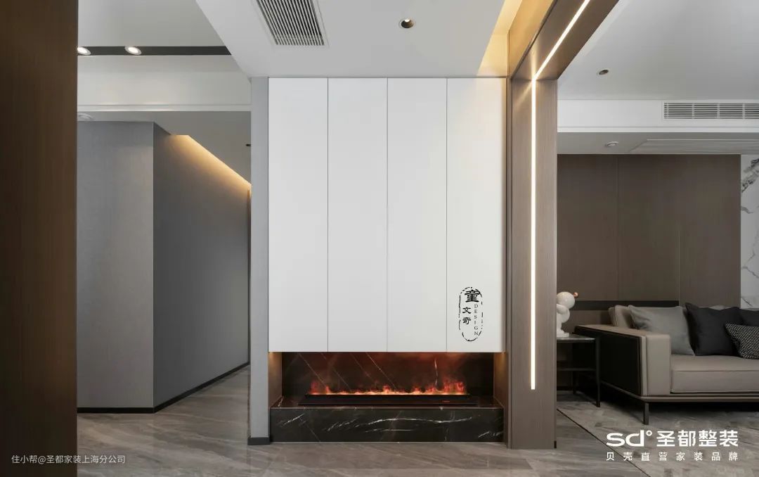 在《银色山泉》的案例中,玄关端景以淡金波纹不锈钢与简约的石膏线构成顶面;立面则是金属走边包裹长虹玻璃,搭配利落的乳白栅格,更显清贵雅致。