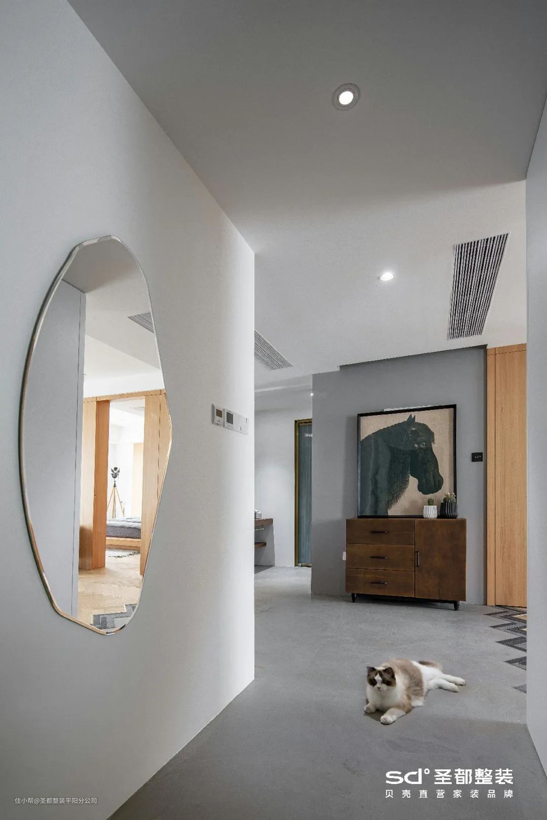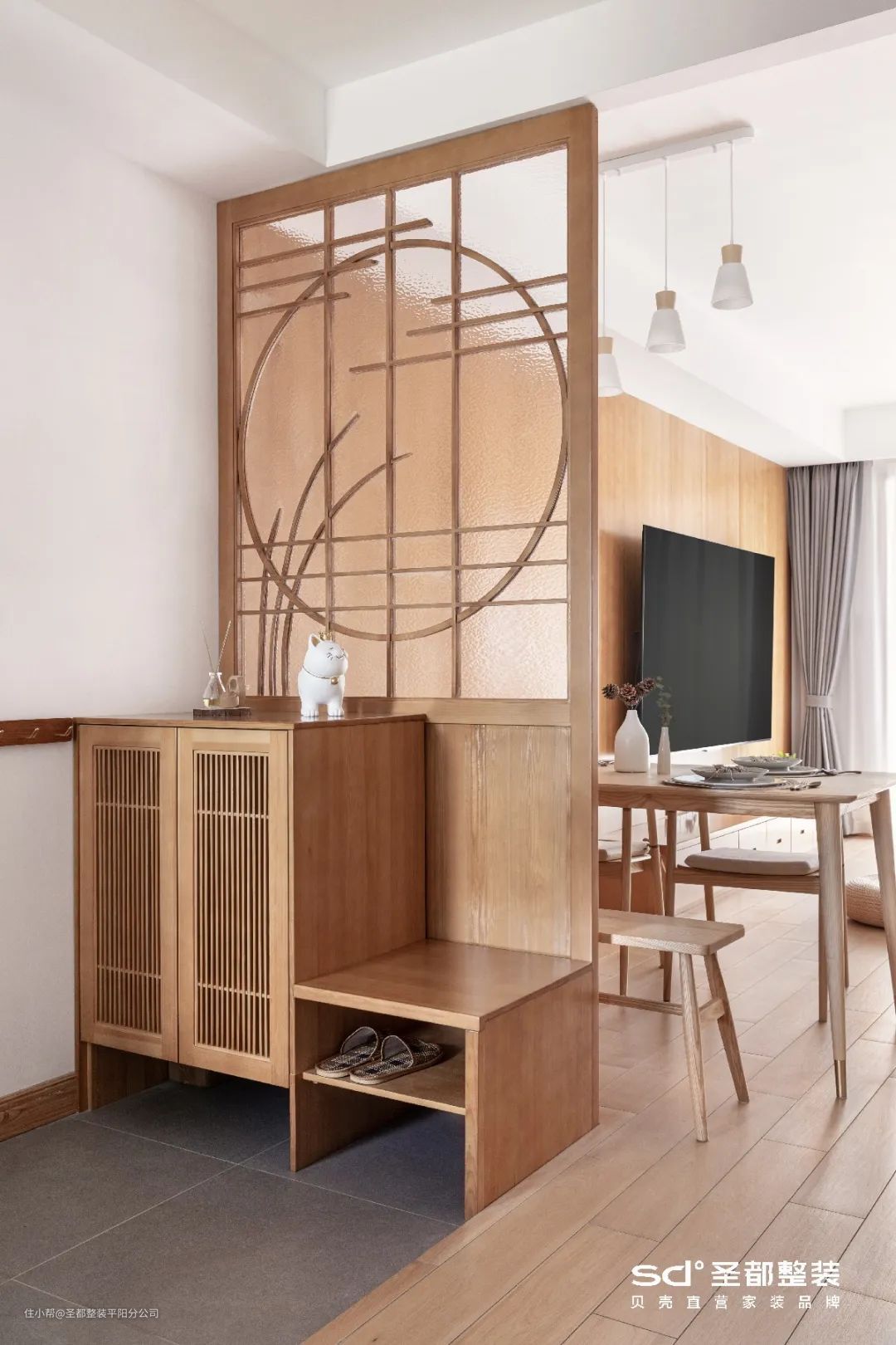 在《清泉石上流》的案例中,玄关一侧定制收纳柜,一侧设计成端景,兼顾颜值与功能。最妙的是长虹玻璃的仙气加持,让空间趋于空灵澄澈。