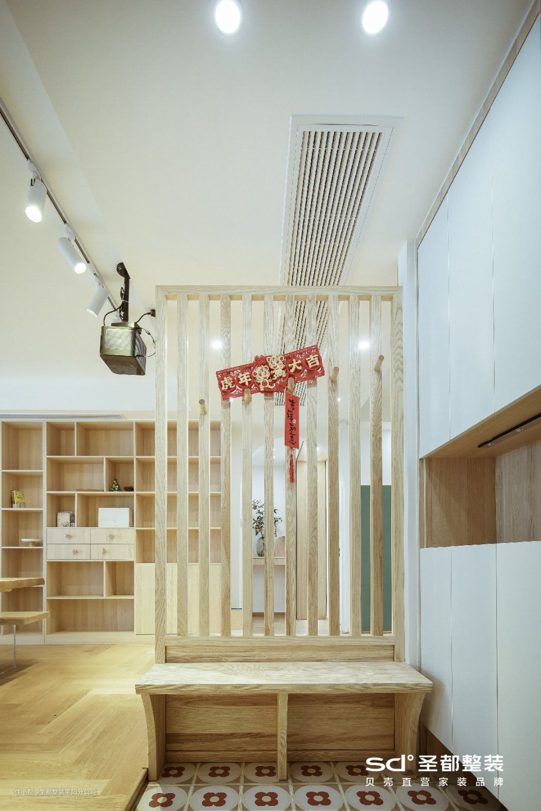 在《别梦寒》的案例中,除却功能的考虑,玄关的颜值也颇高:原木与白的经典搭配,小红花花砖清新有趣,缓冲了原本的单调感。