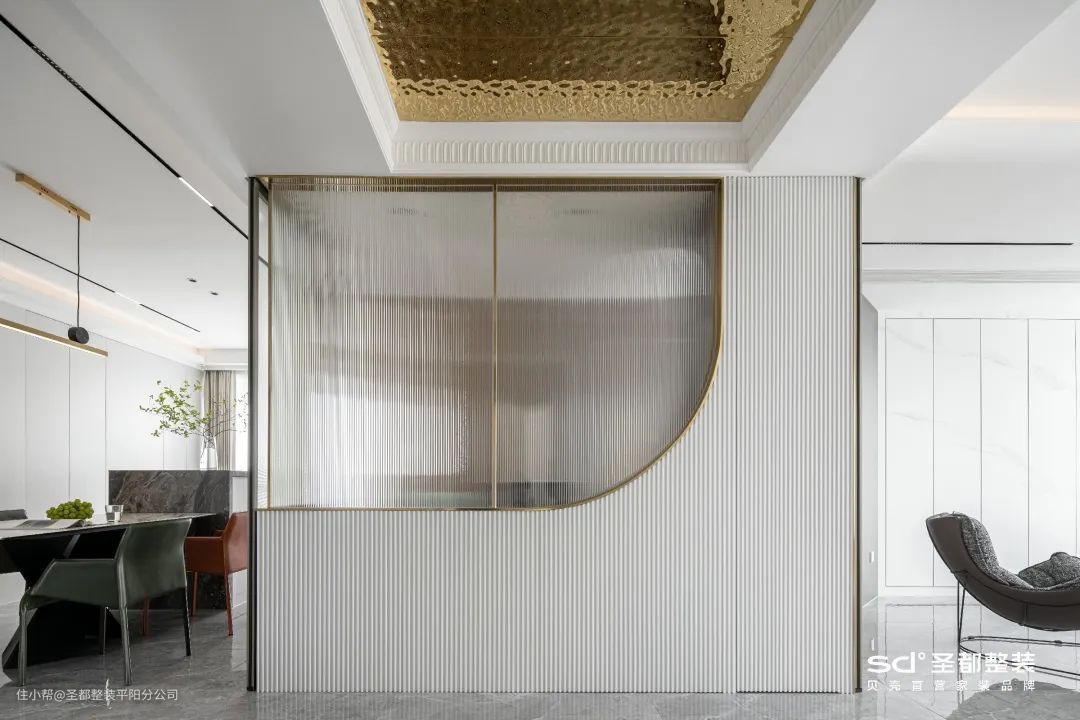 在《银色山泉》的案例中,玄关端景以淡金波纹不锈钢与简约的石膏线构成顶面;立面则是金属走边包裹长虹玻璃,搭配利落的乳白栅格,更显清贵雅致。