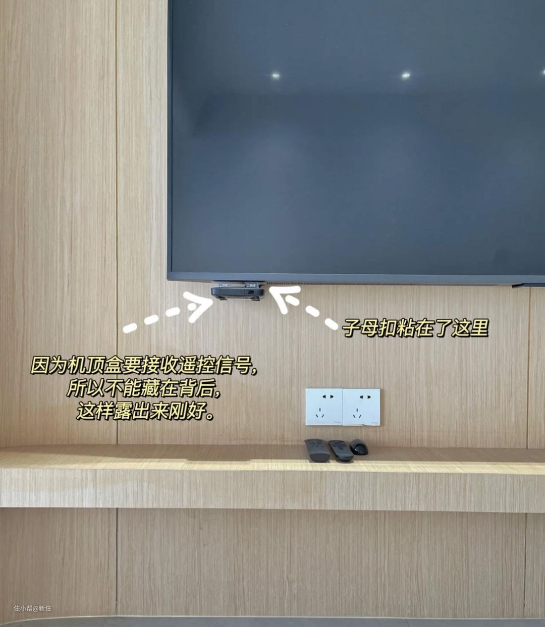 或者,直接用子母扣把电视盒子贴在外面,信号一点影响没有。