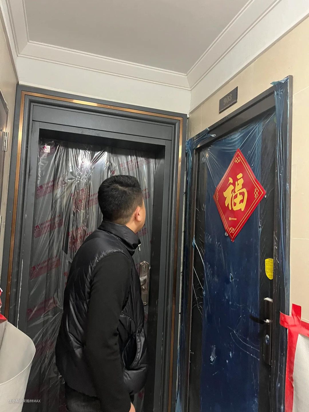 据悉,这位业主家是刚交的房,还没装修就碰上隔壁邻居换入户门。
