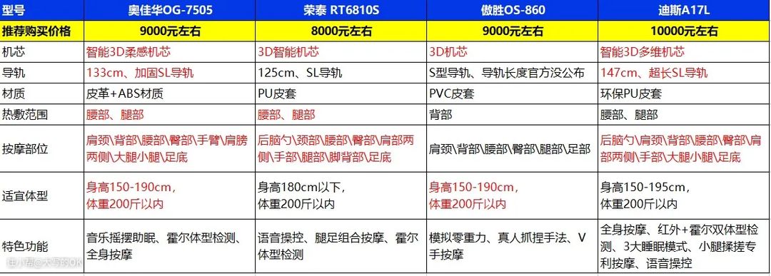 而奥佳华OG-7505、荣泰RT6810S、傲胜OS-860、迪斯A17L这四款基本上都是这个价位下品牌下最具代表性的款式,而且用料、做工、评价都是相当好的。
