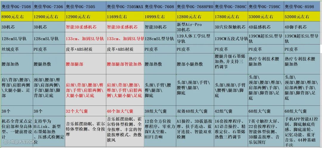 下面进入正题,详细分析一下奥佳华OG-7508、7306、7505、7505MAX、7608、7688、7808C、7598C、8598到底应该怎么选!