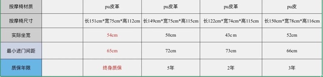 在按摩椅的材质上,4款采用的都是PU皮的材质,这种材质的特点是性价比高、耐磨耐刮,目前大多数按摩椅都采用PU皮材质。虽然真皮材质也不错,但是在性价比和耐磨性上不高,还不环保。