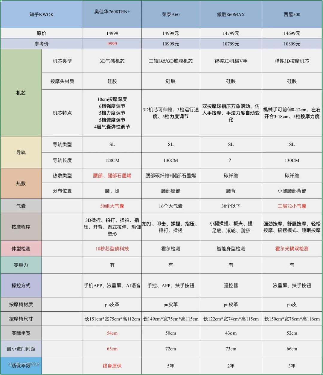 (表格顺序为:奥佳华7608TEN+ 、荣泰A60、傲胜860max、西屋s500)