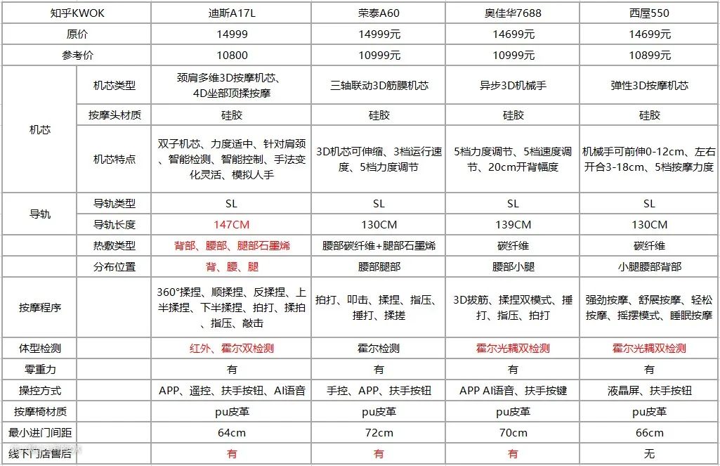 导轨总结:迪斯147CM>奥佳华7688 139CM>荣泰A60=西屋550 130CM