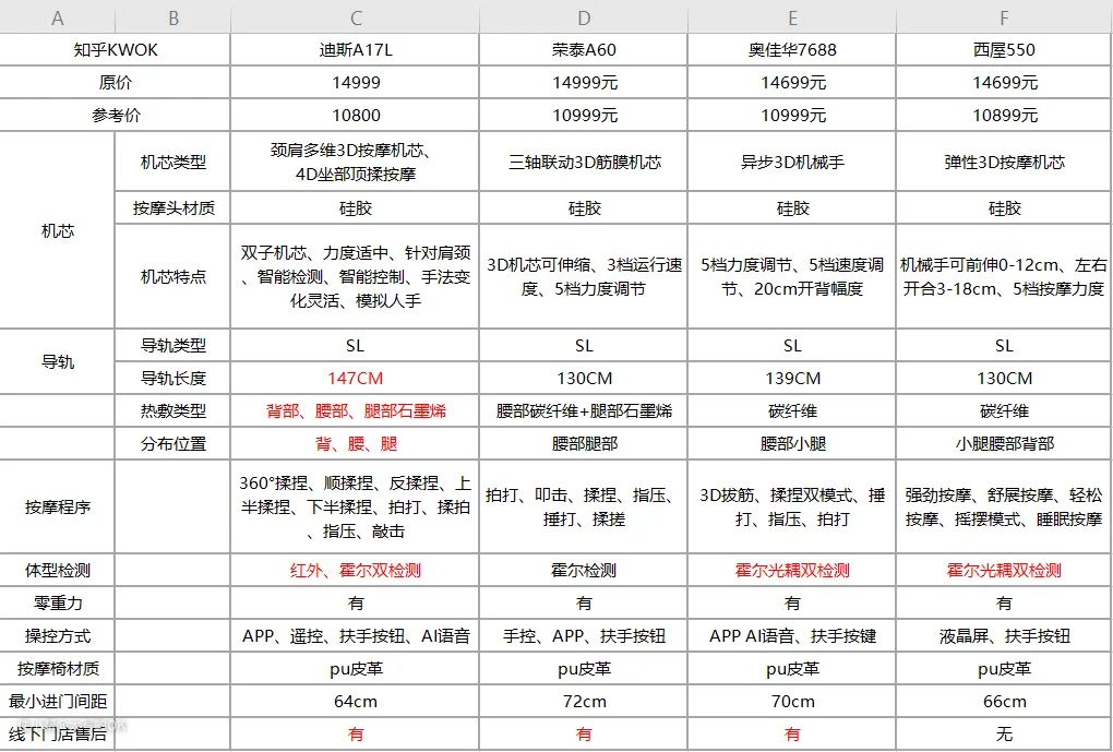 二、迪斯A17L、荣泰A60、奥佳华7688、西屋S500四款按摩椅哪个更值得选?