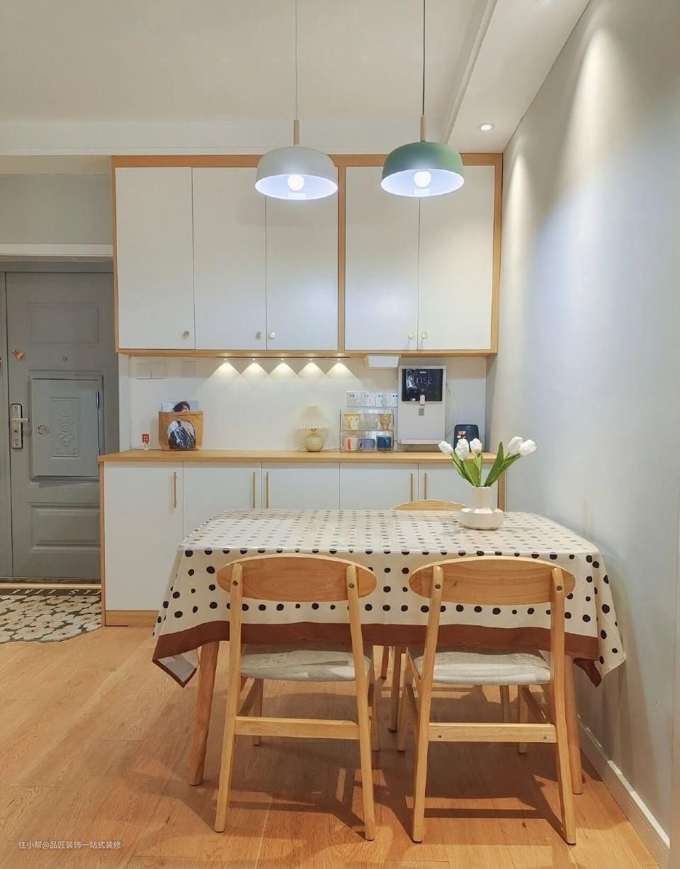 奶油原木风格餐厅中选用简约原木餐桌,复古波点的桌布,脚感舒服、自然环保的木地板,原木制奶白色的收纳柜,其造型清新大气,用餐环境的布置唤醒真挚朴素的情感。