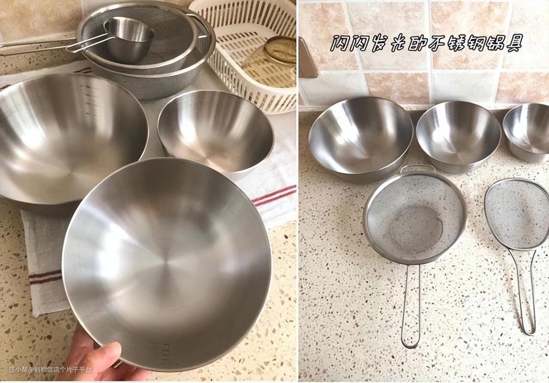厨房里的不锈钢锅具绝对是一大亮点,它们闪闪发光,虽然已经使用了好几年,但依然看起来崭新,没有发黄或者污渍,干净得就像一面镜子。